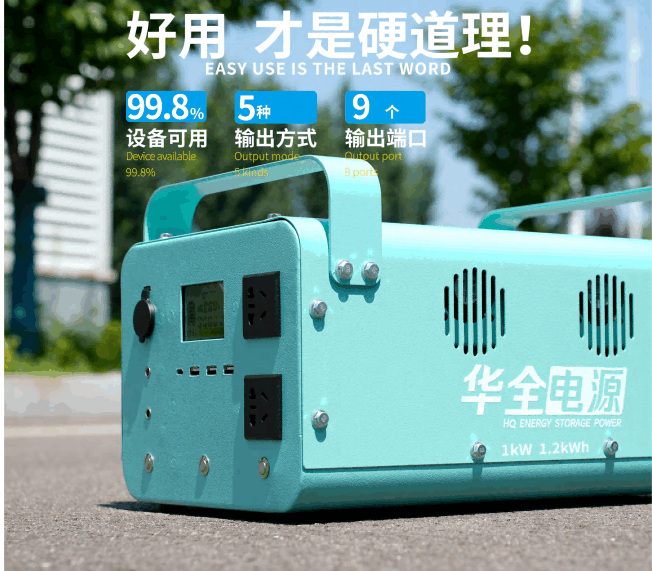 舉例來說,如華全HQDY-1000-A戶外電源,額定功率1000W,電量為1200Wh(≈1.2度電),而1度電可以讓電動汽車跑5~8公里,這個距離足以應(yīng)付很多事了。